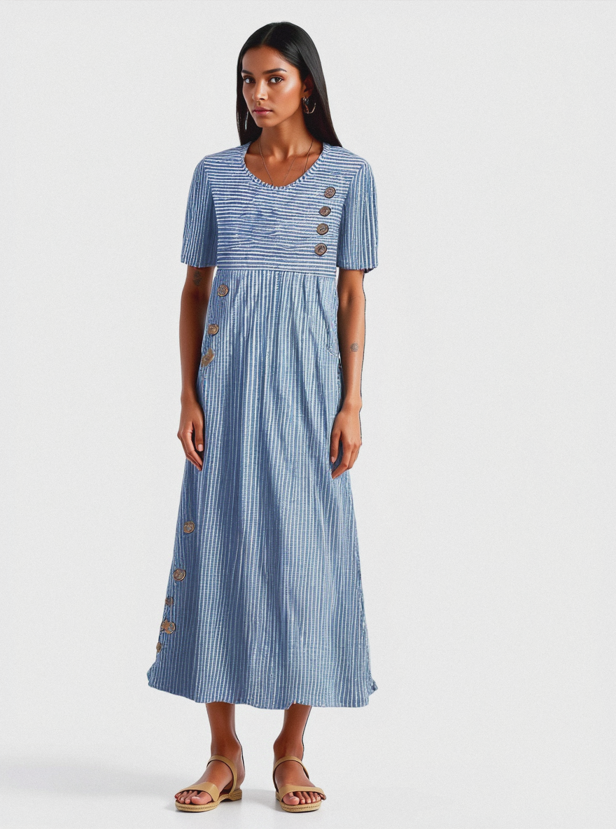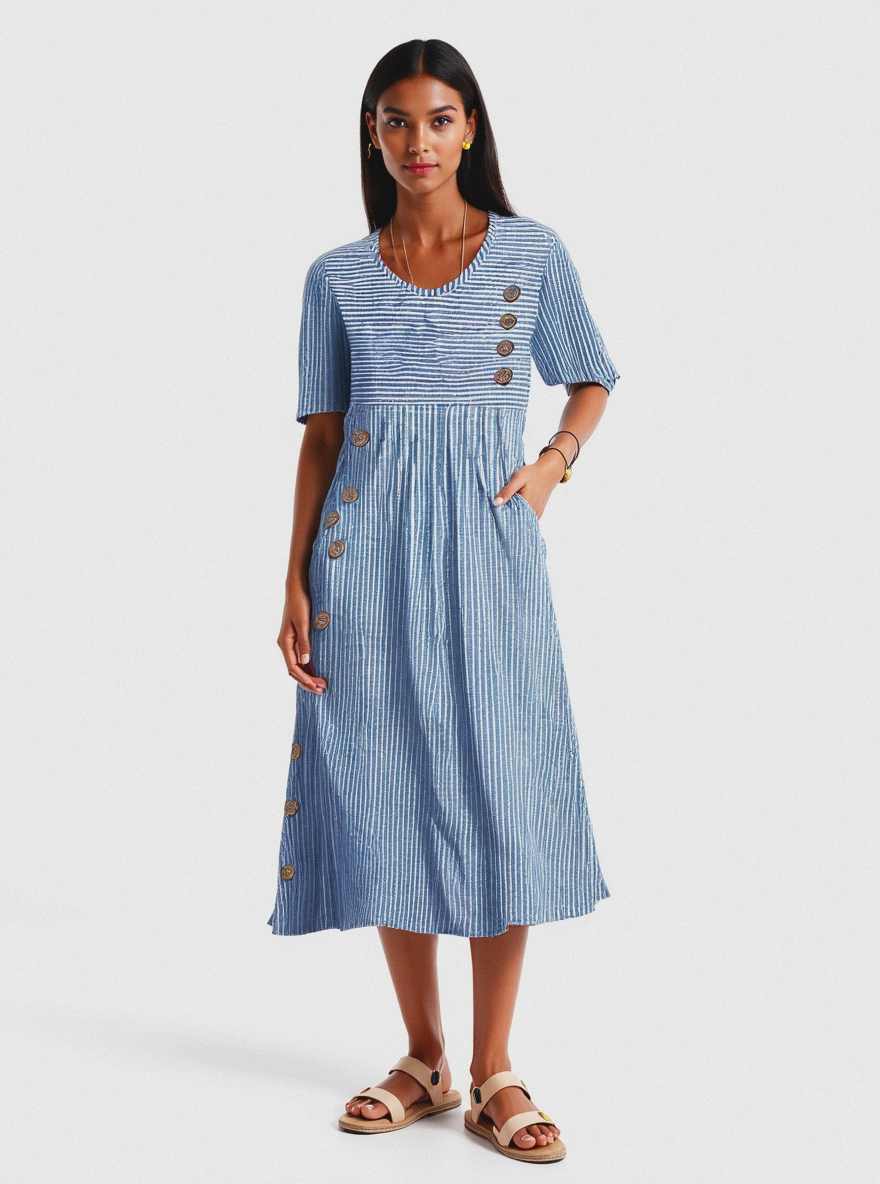 Laat je omarmen door lichtheid, comfort en tijdloze stijl met Sofia - Elegante gestreepte zomerjurk. Een luchtige en flatterende oplossing voor warme dagen, waarop je je goed wilt voelen en er goed uit wilt zien. Perfect voor vrouwen die de buik willen verbergen zonder in te boeten op elegantie.
