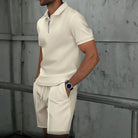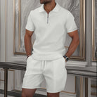 Maak kennis met de perfecte zomercombinatie voor de moderne man. Deze stijlvolle tweedelige set – bestaande uit een short en een short-sleeved waffle-knit shirt met rits en reverskraag – straalt comfort én klasse uit. Of je nu door de stad loopt, op vakantie bent of gewoon casual gekleed wilt zijn met een verzorgde look: deze set doet het allemaal.